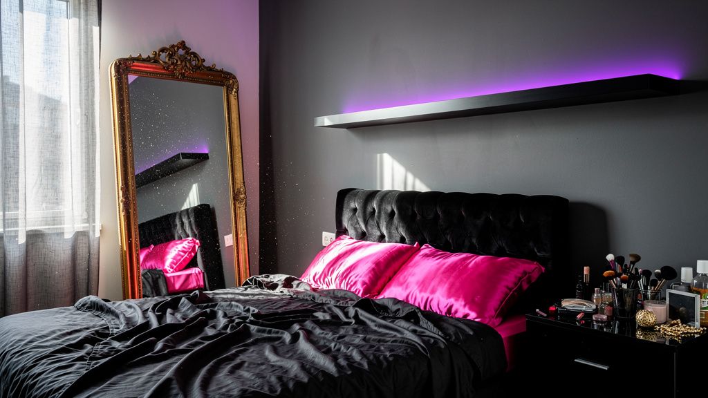 Dark Baddie runs closer to moody glamour deep jewel tones, black velvet, metallic accents in silver or bronze rather than gold, and lighting that stays warm and low rather than colorful. This variant is harder to execute on a budget because it relies more heavily on actual furniture quality and less on accent pieces. A cheap black bedframe reads differently than a cheap pink one.